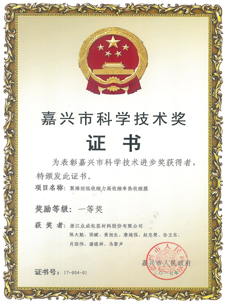 2017嘉兴市科学技术进步一等奖-低收缩力高收缩率膜